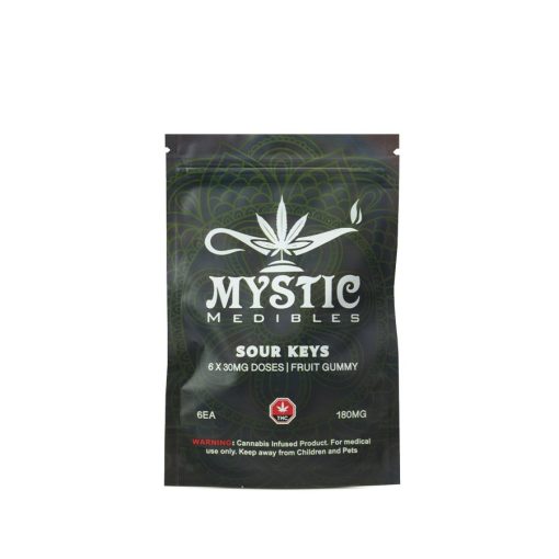 Stay medicated and enjoy the superior benefits of cannabis while satisfying that adult sweet tooth with Mystic Medibles Sour Keys! These delicious THC infused gummy candies are made with wholesome natural flavours and made using an infused coconut oil base for the best absorption. Each package of Mystic Medibles Sour Keys contains 180mg of THC and comes with 6 delicious weed infused fruity candies that are covered in a layer of sour sugar for an added kick!